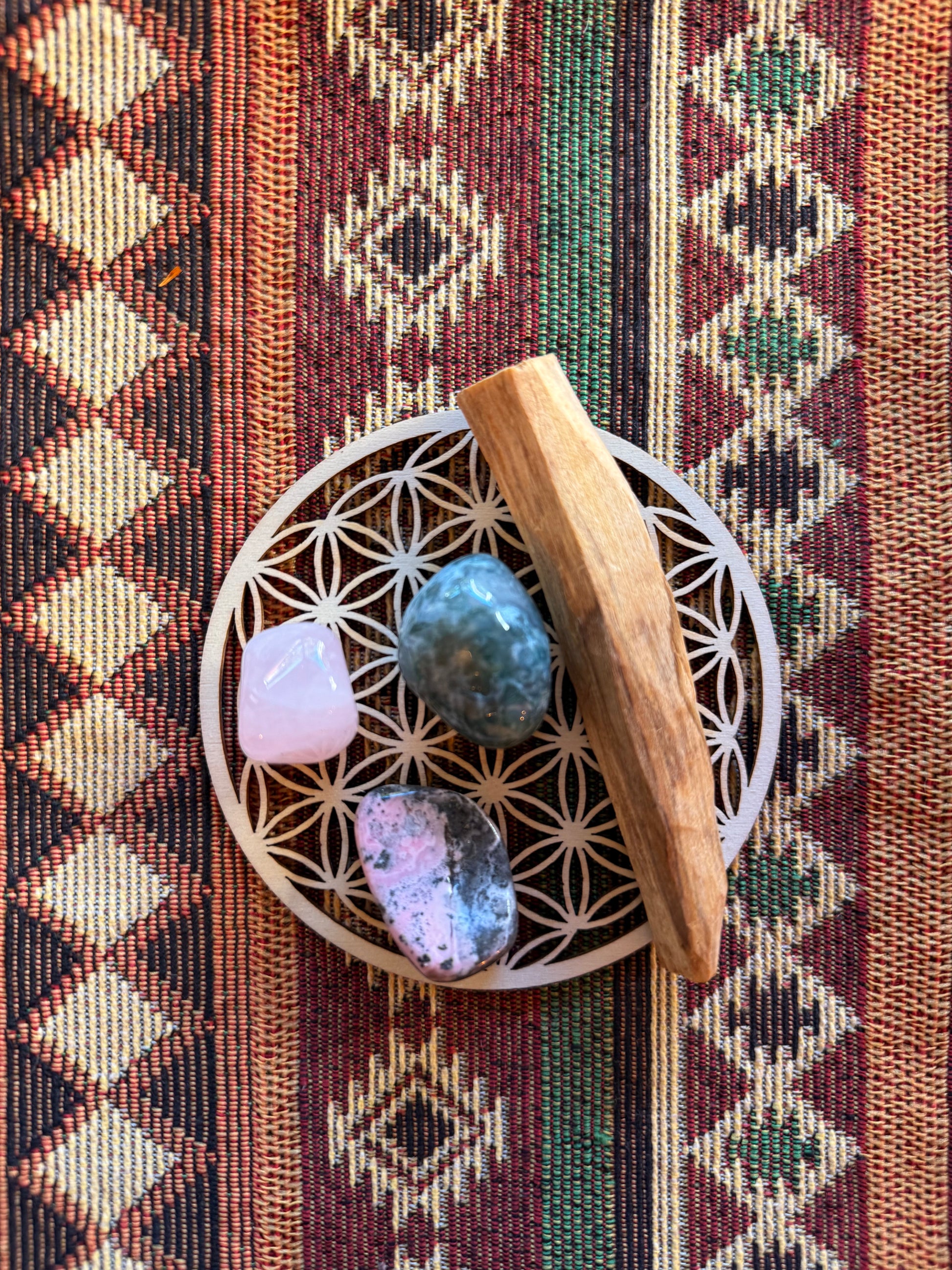 Le kit contient 3 pierres, une plaque de rechargement en bois fleur de vie et un baton de palo santo.