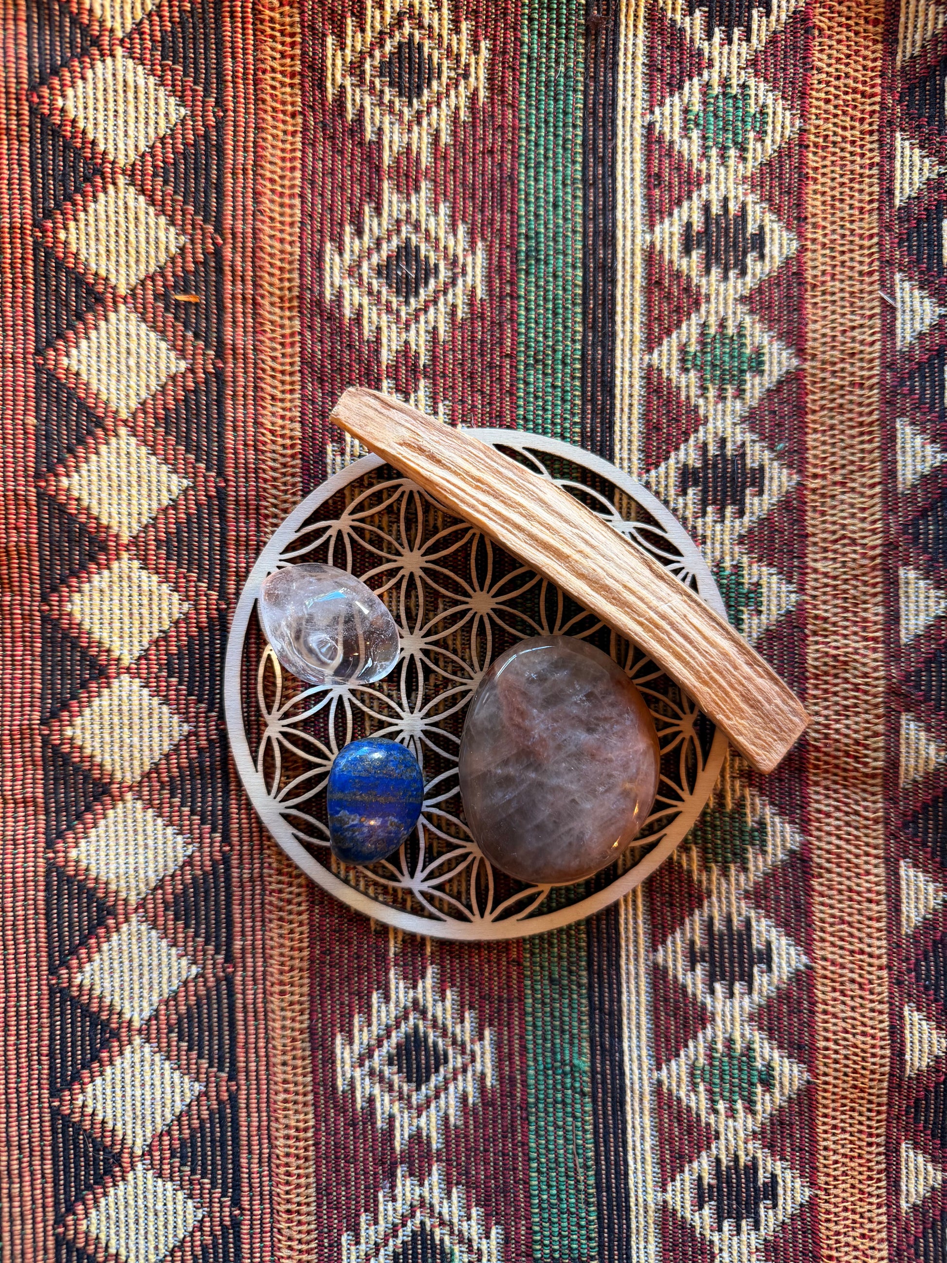 Le kit contient 3 pierres, une plaque de rechargement en bois fleur de vie et un baton de palo santo.