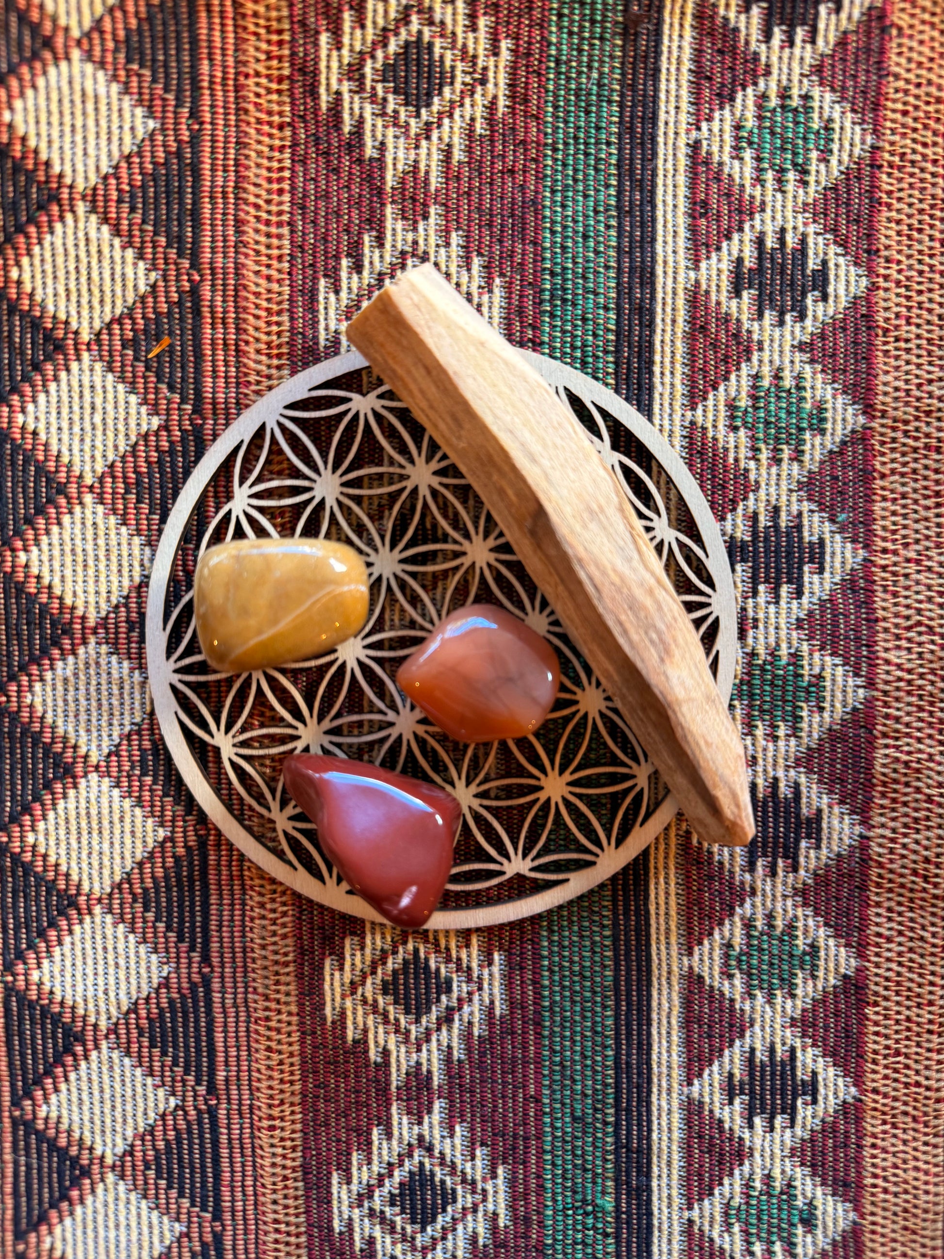 Le kit contient 3 pierres, une plaque de rechargement en bois fleur de vie et un baton de palo santo.